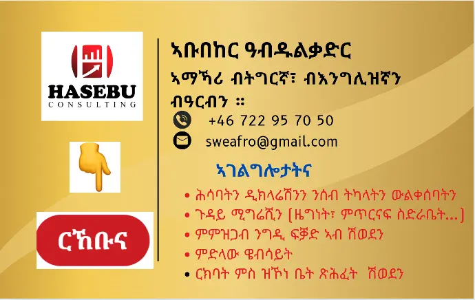 ነዚ ሃጓፍ እዚ ንምምላእን ብቋንቋ ትግርኛ፣ እንግሊዝኛ፣ ዓረብኛን ሽወደንን ክትሕገዝሉ እትኽእልሉ ዕድል ብትካል HASEBU General Consulting ተኸፊትልኩም ኣሎ እሞ ነዞም ዝስዕቡ ጉዳያት ከምነማኽር ከነበስረኩም ንፈቱ!